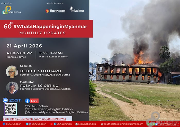 On 21 April, 2026 at 4-5pm (Bangkok Time), SEA Junction in collaboration with media partners, Mizzima and The Irrawaddy, will hold the 60th#WhatsHappeninginMyanmr.This update is the aim of contributing to a greater understanding of the crisis situation there for informed action in support of the democratic movement in the country and beyond.