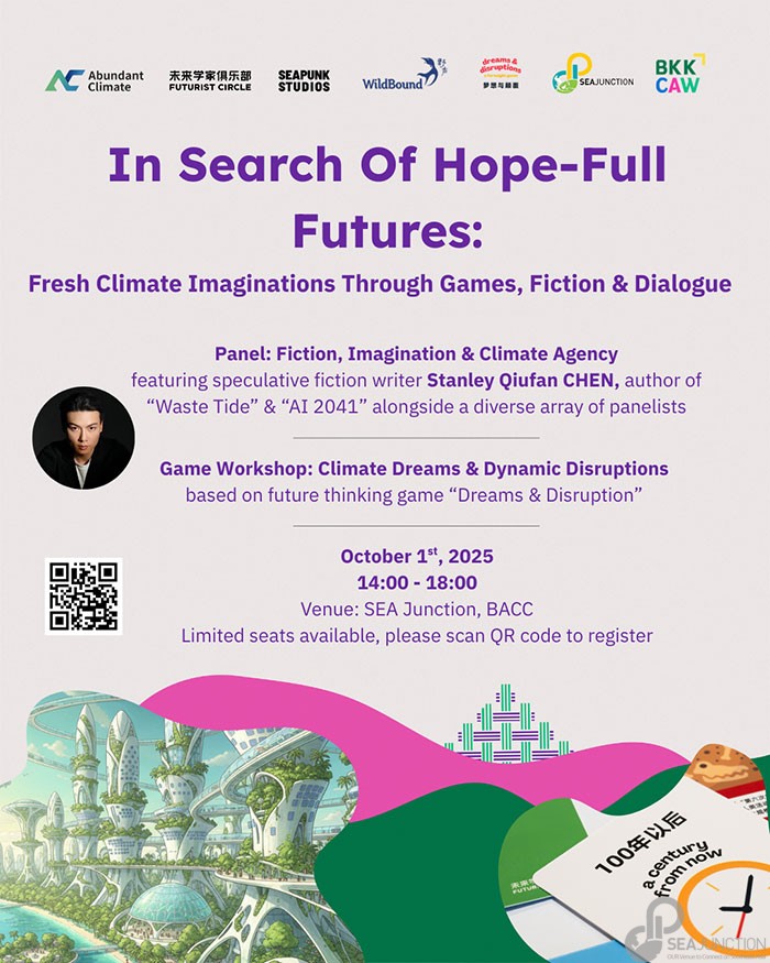 The program consists of two parts: a panel on Fiction, Imagination & Climate Agency, which explores how speculative storytelling can inspire fresh perspectives on climate futures, and a game-based workshop, Climate Dreams & Dynamic Disruptions. Using the future-thinking board game Dreams and Disruptions, participants will co-create alternative scenarios for Asia’s islands and oceans shaped by climate and socio-technological drivers.