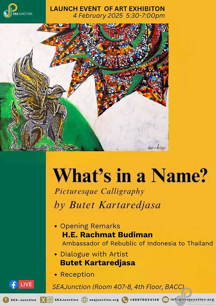 On 4th February 2025 from 5.30 – 7.00 PM at our venue, room 407-8, 4th Floor, BACC, we will host the opening of the Art Exhibition “What’s in A Name?” Picturesque Calligraphy which will feature the works of the well-known Indonesian artist and activist, Butet Kartaredjasa.