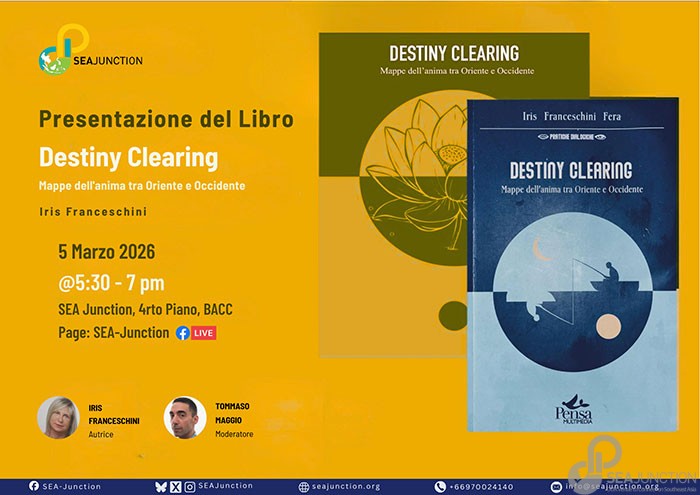 Il 5 Marzo 2026 alle 5.30 PM, SEA Junction organizza una discussione con l’autrice del libro “Destiny Clearing; Mappe dell’Anima tra Oriente e Occidente”, Iris Franceschini, dedicata ala comunità di lingua Italiana a Bangkok. L’incontro sarà moderato da Tommaso Maggio, educatore e autore residente a Bangkok.