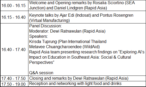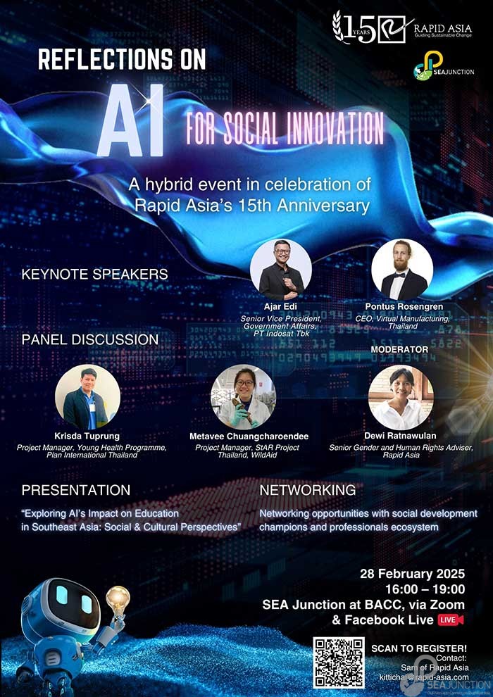 As part of its 15th-anniversary celebration, Rapid Asia is holding a public discussion at SEA Junction on 28 February 2025 from 4.00 – 7.00 pm on the roles of artificial intelligence (AI) in shaping the future of social development work in the region. The event, titled “Reflections on AI for Social Innovation,” will be hosted in a hybrid format, welcoming participants both in person and online, with the aim to explore the multiple dimensions of artificial intelligence (AI), including the growing influences of AI, its impact on employment and education, and roles of AI in the development sector in Southeast Asia and beyond.