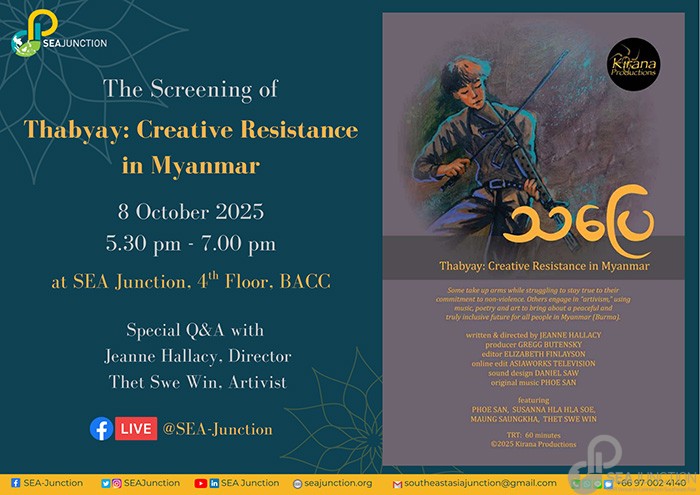 SEA Junction will be screening a new documentary “Thabyay”: Creative Resistance In Myanmar, directed by Jeanne Hallacy. This screening sheds light on Myanmar’s ongoing people-power revolution through the stories of four leaders navigating the difficult choices between armed resistance and the path of non-violence. The film captures their struggles, hopes, and the powerful role of art, music, and poetry as tools of “artivism” in the fight for a peaceful, democratic, and inclusive future for all people in Myanmar. Questioning happens when non-violent leaders are pushed to support armed struggle against a brutal regime in a forgotten war?