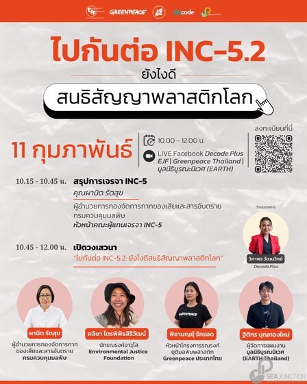 งานเสวนา “ไปกันต่อ INC 5.2: ยังไงดีสนธิสัญญาพลาสติกโลก” จะจัดขึ้นในวันที่ 11 กุมภาพันธ์ 2568 เวลา 10.00 – 12.00 น. และจะมีการดำเนินรายการเป็นภาษาไทย พร้อมทั้งมีการถ่ายทอดสดทางเพจ SEA Junction, Decode.plus และ เพจของพันธมิตรเครือข่าย