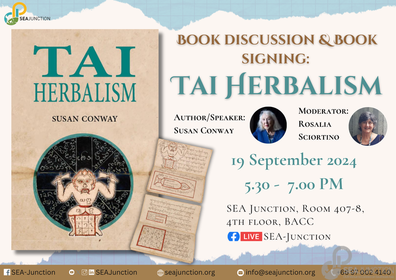 On 19 September 2024 from 5.30 pm – 7.00, SEA Junction has the opportunity to welcome cultural expert Susan Conway, to discuss her recently published book “Tai Herbalism”. The book, published by Silkworm Books, is based on a translation of an early nineteenth-century manuscript written in an old Shan script in danger of extinction. At most, only a handful of older adults in Burma can read it. The author achieved a translation with the help of monks and lay people living in remote villages and monasteries. It reads like a detective novel.
