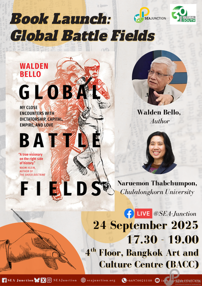 Focus on the Global South, in collaboration with SEA Junction, hosted a special launch of Global Battlefields: Memoirs of a Global Activist by Filipino scholar and activist Dr. Walden Bello, who shared reflections on his lifelong journey across struggles for social justice, democracy, and human rights. The event is a part of the 30th year anniversary celebration of Focus on the Global South. The book was introduced by Dr. Naruemon Thabchumpon, Associate Professor of Politics and Head of the Center of Excellence on Migration and Development at Chulalongkorn University. The program has been broadcast live on SEA Junction’s Facebook page and is now available to watch on YouTube and SEA Junction website.